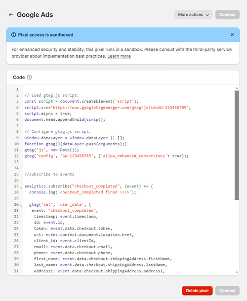 Template for how you can easily implement Google Ads purchase conversion pixel as a Shopify customer event, this template also support's Google’s Enhanced Conversions tracking.